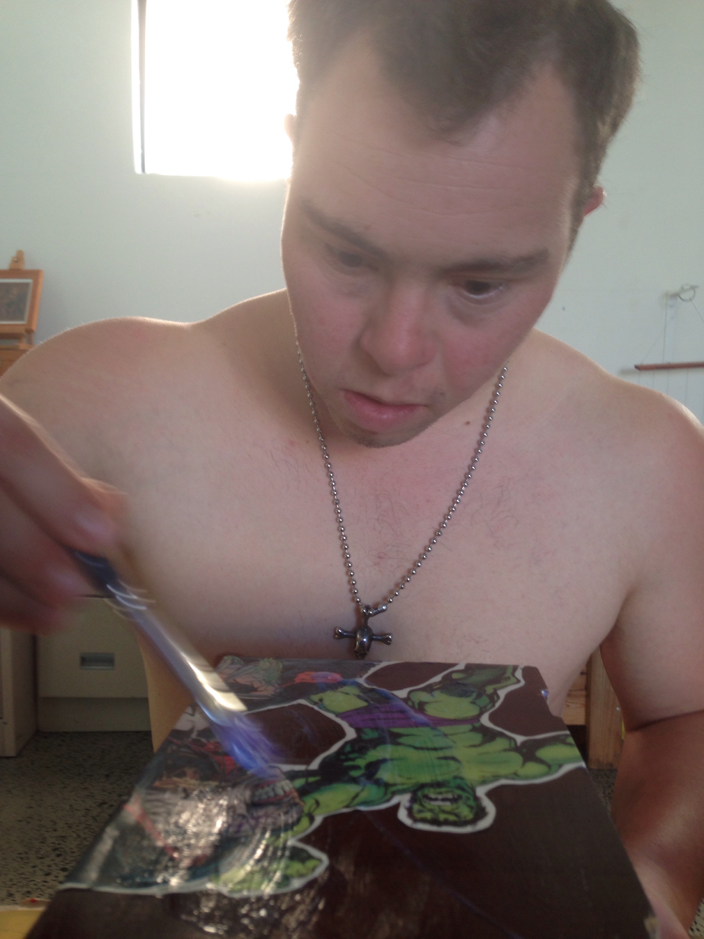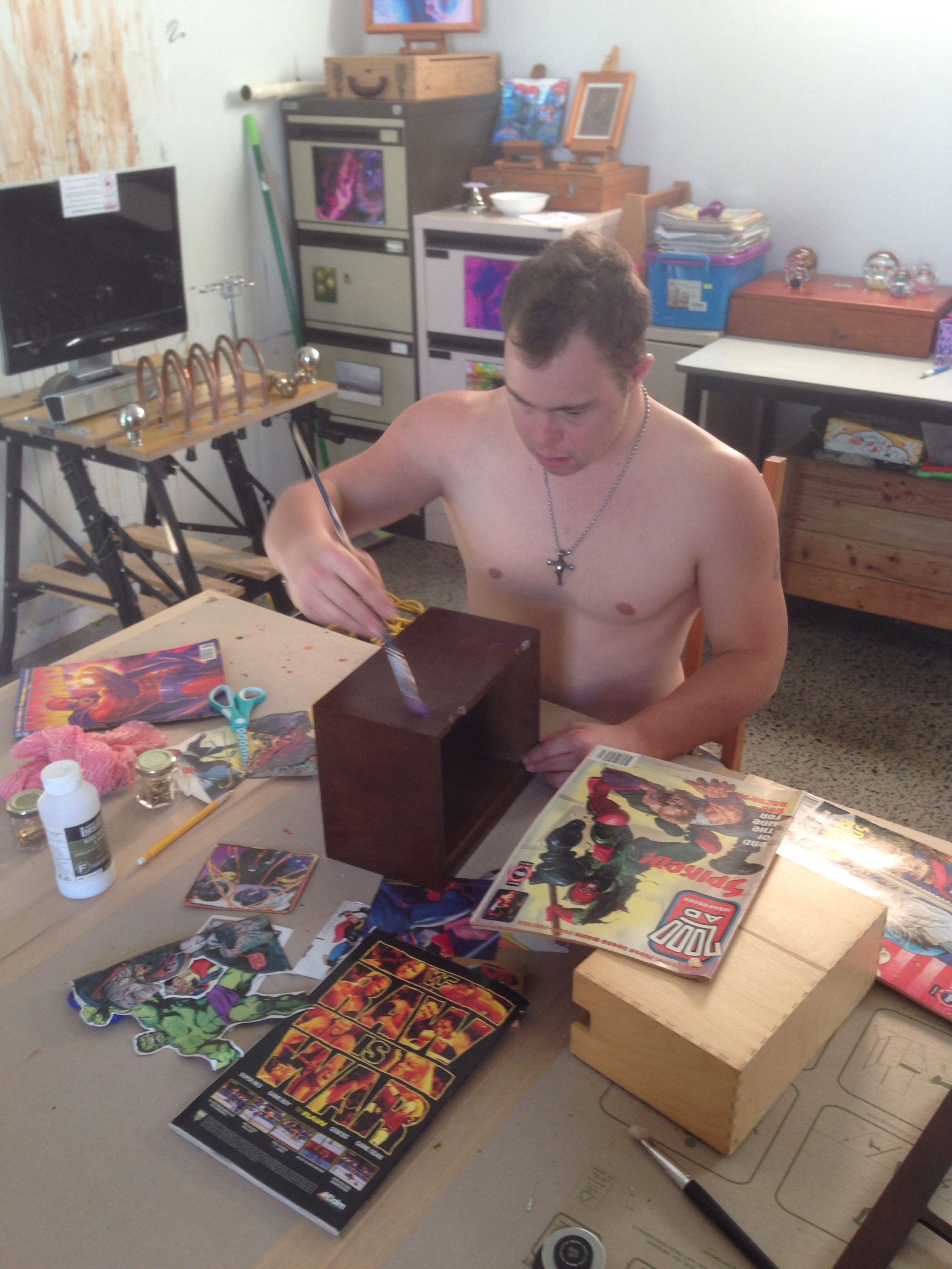 Zac and I went op-shopping for a receipt box and comic books. $3 later and we were back at the studio with a broken photo box and some old comic book catalogues.